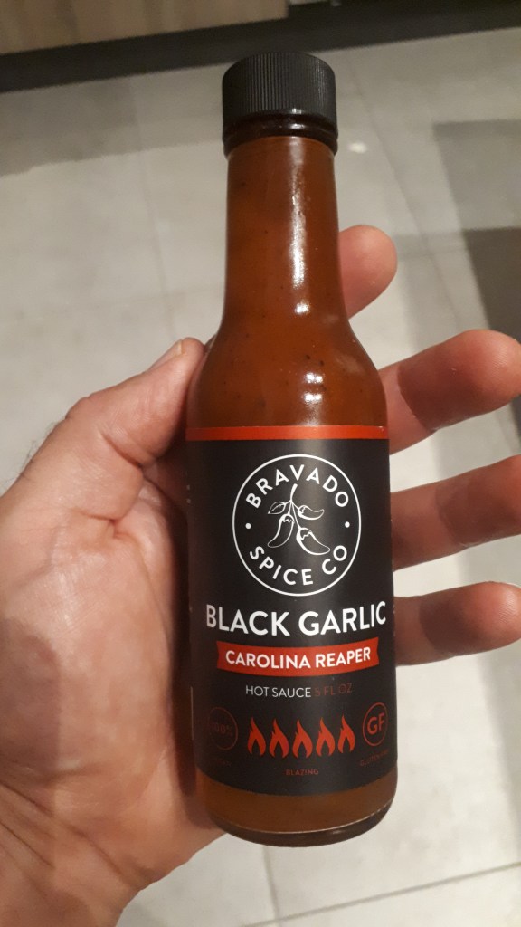 Bravado Black Garlic and Carolina Reaper July 13, 2020 / brunovandooren Pretty good hot sauce for spaghetti and stir fry. Not suited for adding to curry. Hotness: hot Taste: good Share this: Click to share on X (Opens in new window) X Click to share on Facebook (Opens in new window) Facebook Like Loading... Related