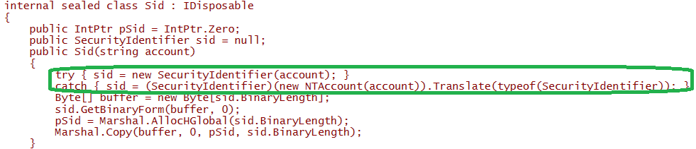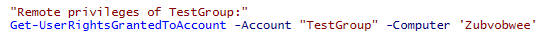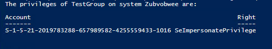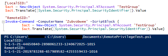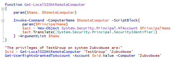 The account can be supplied either as an actual SID, or as a name which is then translated to a SID. The problem here is that if we supply the name of a local principal for looking up the privileges on a remote computer, we mean the local group on ‘that’ system, not the local group on this system. Logically, the remote group will have a different SID. This can be demonstrated easily enough: