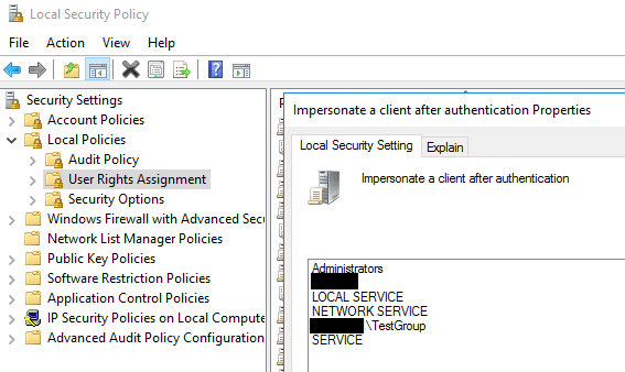 On the remote computer, I used the Local Security mmc to grant the Impersonation privilege to that local group: